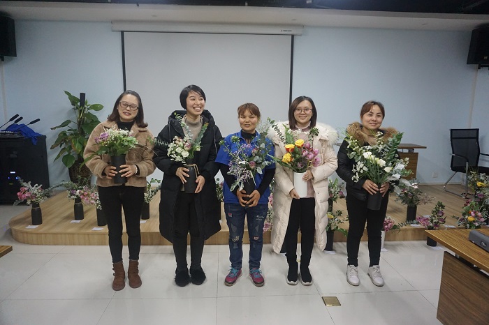 經(jīng)過2個(gè)小時(shí)的培訓(xùn)和親手實(shí)踐,在老師的精心指點(diǎn)下,一束束錯(cuò)落有致、生機(jī)盎然的插花作品展現(xiàn)在了大家眼前,看著通過自己雙手制作成的插花作品,大家的臉上都洋溢著喜悅的笑容,紛紛用手機(jī)記錄下這精彩瞬間?;顒?dòng)最后,在徐珍老師和各位女同胞的評(píng)選下,出現(xiàn)了華數(shù)本年度五位“最佳花藝設(shè)計(jì)師”!