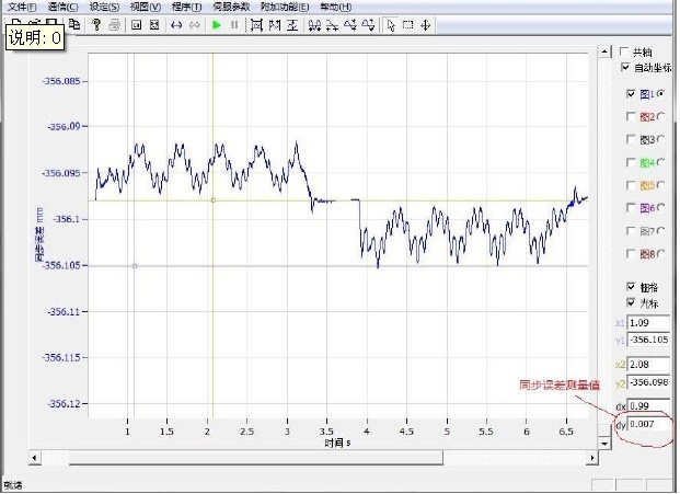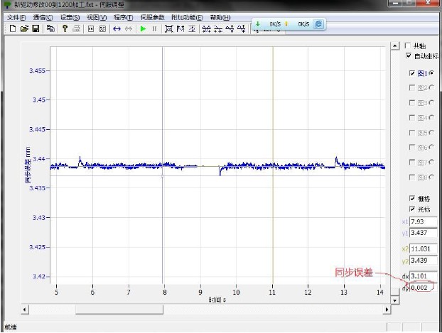 ?8) 單擊開始采樣(請(qǐng)確保此時(shí)NC正在運(yùn)行剛性攻絲程序),得到剛性攻絲同步誤差圖如下: