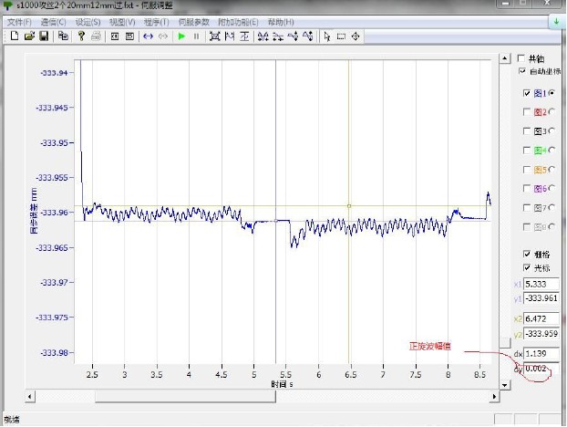 ????? 圖1及圖2中出現(xiàn)的正旋波為Z軸電機(jī)特性,與電機(jī)的極對(duì)數(shù)相關(guān),電機(jī)每轉(zhuǎn)一圈產(chǎn)生極對(duì)數(shù)個(gè)正旋波,該正旋波的幅值也可通過(guò)加大速度比例增益減小。