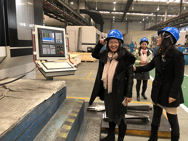 ▼工信部裝備司機(jī)械處處長佘偉珍、工信部產(chǎn)業(yè)發(fā)展促進(jìn)中心副處長王峰麗參觀配套華中8型數(shù)控系統(tǒng)的九軸六聯(lián)動葉片砂帶磨削數(shù)控機(jī)床