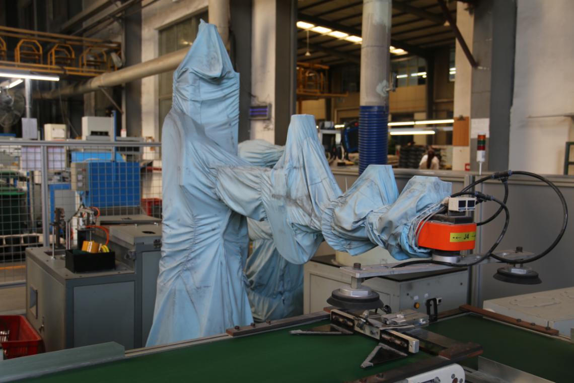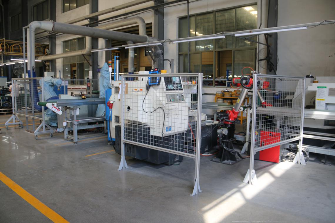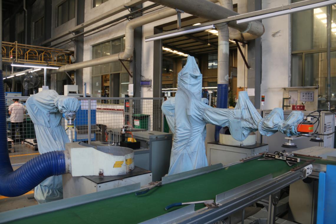 走近仔細(xì)一看,原來這些神秘俠客是一臺(tái)臺(tái)穿著防塵服的華數(shù)機(jī)器人,它們的主要工作是機(jī)器人打磨和機(jī)床上下料。