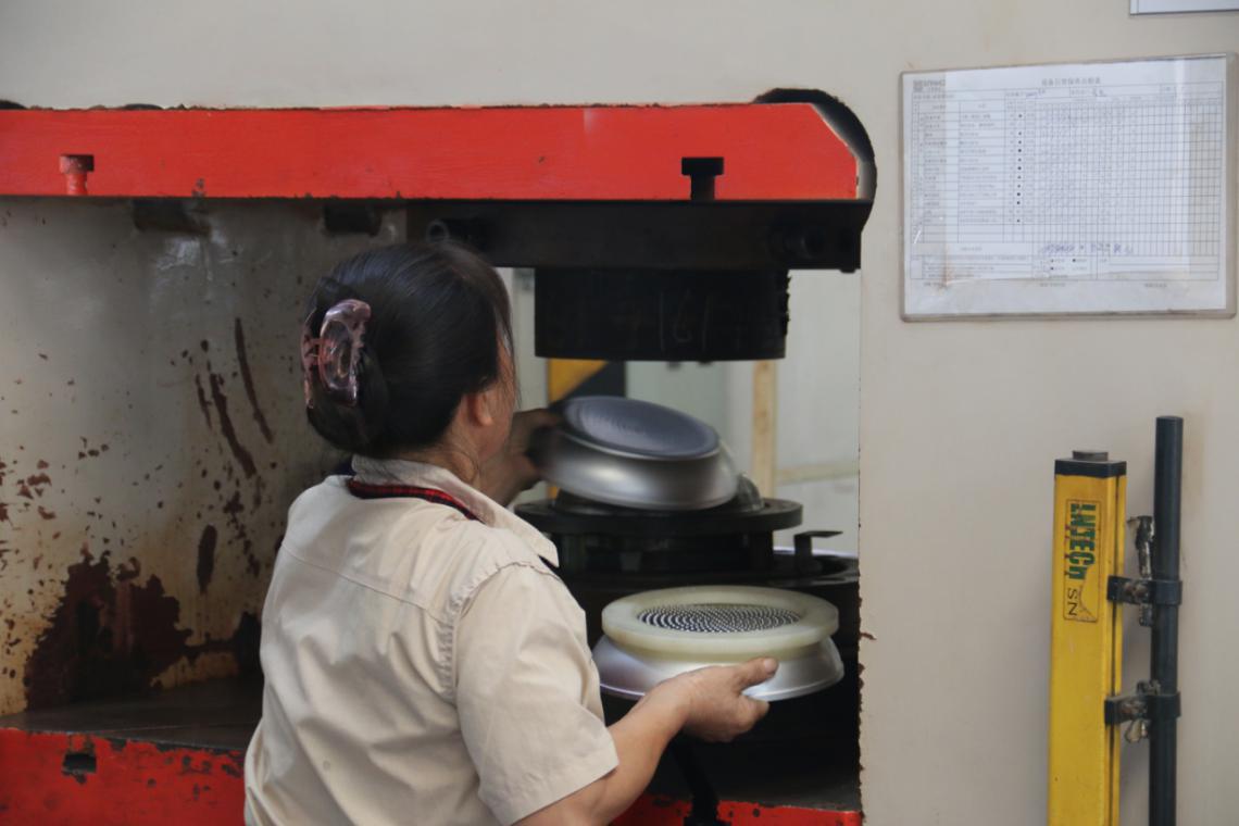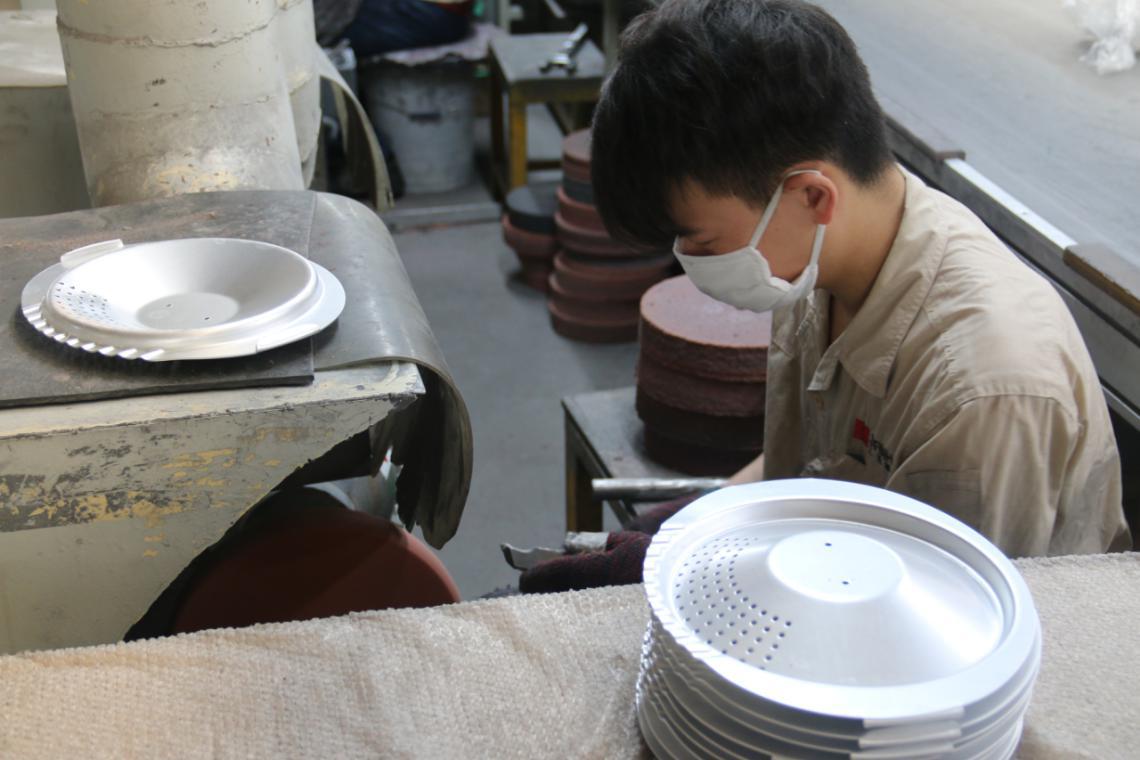 鍋具打磨以前是靠工人一件件的手工打磨,粉塵多,噪音高,勞動(dòng)環(huán)境非常惡劣,你看那位坐在角落里的小哥哥了嗎,他正在給鍋具打磨,給他點(diǎn)贊,但同時(shí)也替他擔(dān)心。