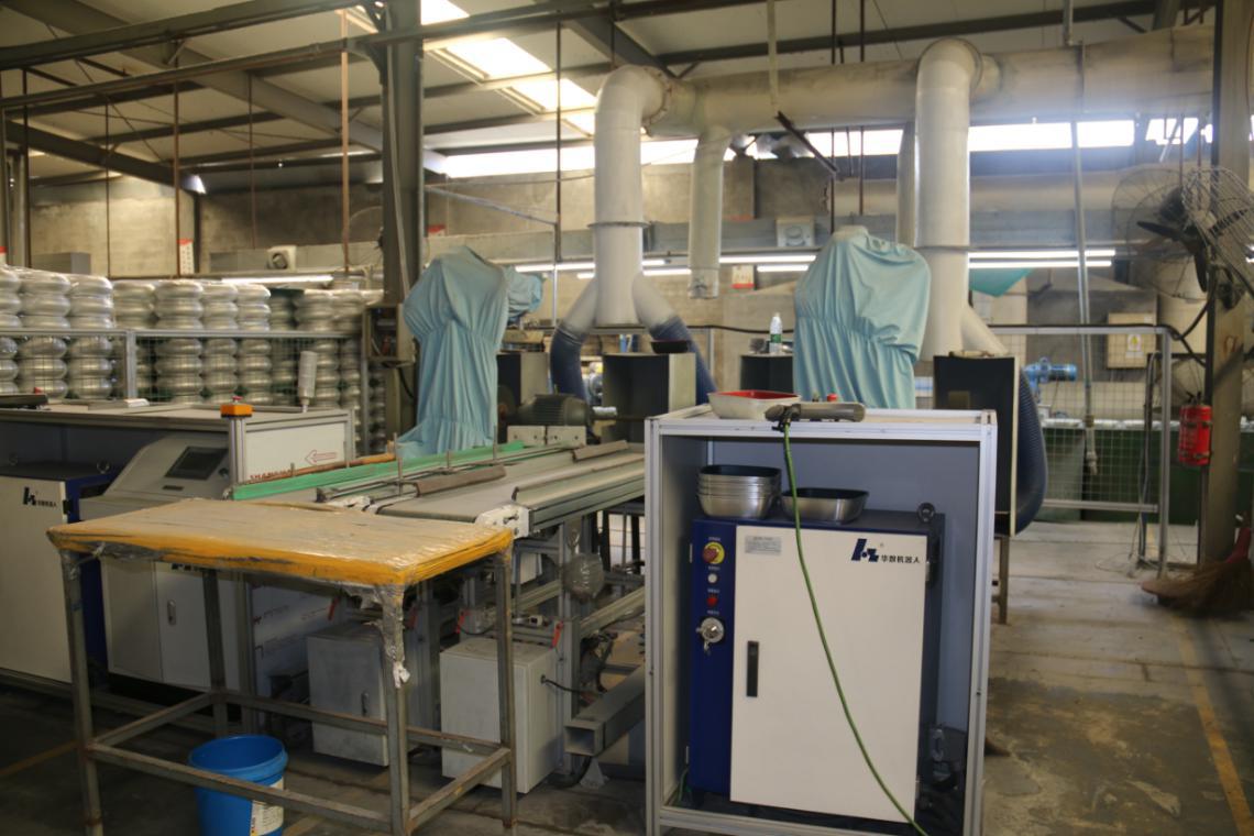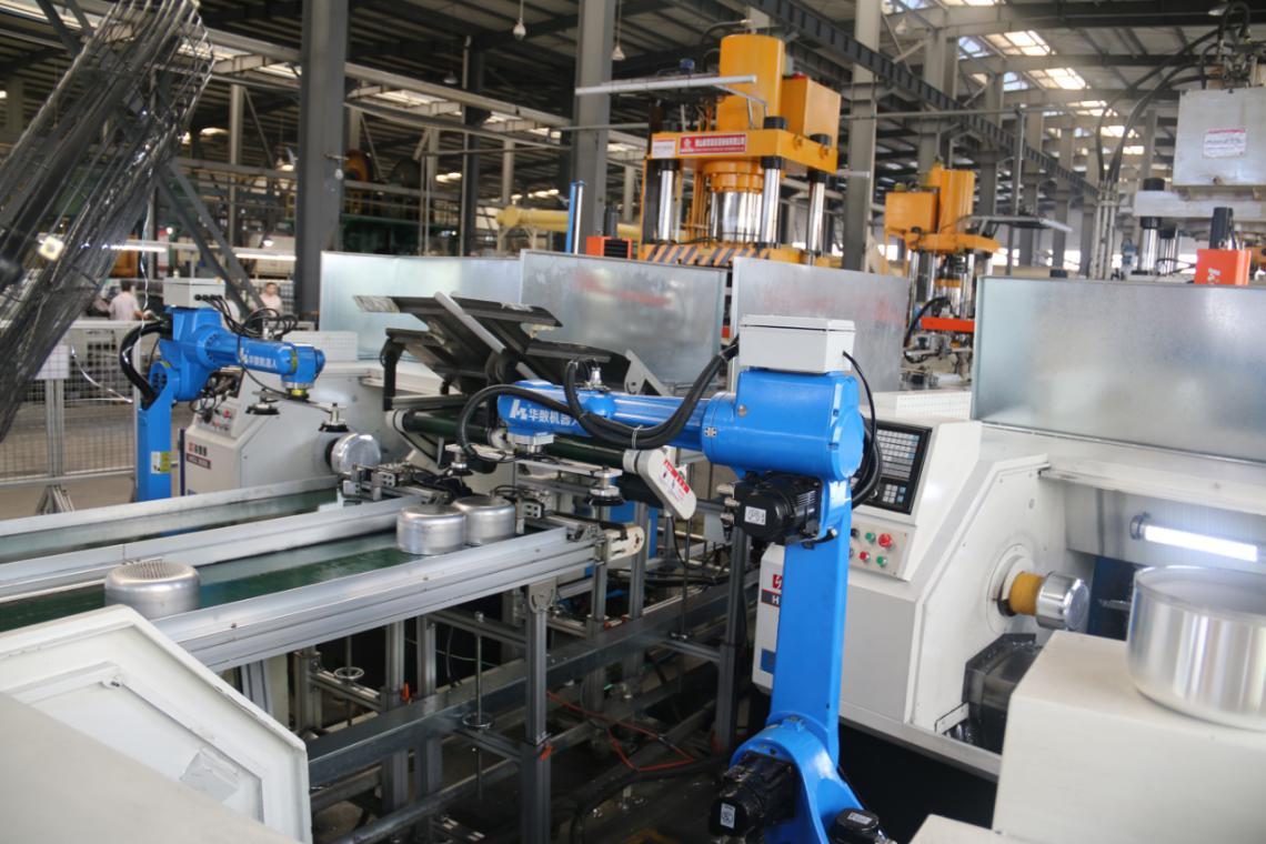 浙江三禾廚具是一家專業(yè)致力于中高端廚房用品的于科研、生產(chǎn)、銷售與服務(wù)一體化的浙江省明星企業(yè)。公司現(xiàn)有職工1200余名,年生產(chǎn)能力達(dá)2400萬只以上。擁有全自動(dòng)的拉伸、噴涂、裝配等生產(chǎn)線,具有雄厚的技術(shù)力量和精優(yōu)的加工設(shè)備。三禾廚具從2016開始與寧波華數(shù)機(jī)器人開展合作,主要是使用華數(shù)機(jī)器人自動(dòng)化生產(chǎn)線,代替人工進(jìn)行鍋具的打磨和上下料。