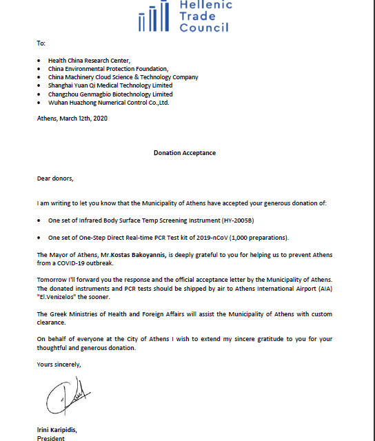 當(dāng)前,新冠肺炎疫情正在全球多個(gè)國家蔓延擴(kuò)散。截止3月20日,希臘共和國累計(jì)確診新冠肺炎病例增加到近500例。面對新冠疫情快速蔓延,希臘共和國總理米佐塔基斯稱“希臘處于戰(zhàn)爭狀態(tài),但我們必將獲勝”。他強(qiáng)調(diào)當(dāng)前希臘政府的首要任務(wù)是“挽救生命”,希臘共和國政府已經(jīng)出臺(tái)一系列措施進(jìn)行防疫抗疫。3月20日,在中華環(huán)境保護(hù)基金會(huì)的協(xié)調(diào)下,武漢華中數(shù)控股份有限公司(簡稱華中數(shù)控)通過希臘共和國駐中華人民共和國大使館,向希臘共和國捐贈(zèng)一臺(tái)HY-2005B紅外智能測溫儀,支援希臘共和國政府開展防疫抗疫工作。為此,雅典市市長專門發(fā)來感謝信,感謝華中數(shù)控為希臘疫情防控提供幫助,據(jù)悉,本次捐贈(zèng)的紅外智能測溫儀將用于雅典國際機(jī)場海關(guān)旅客的體溫檢測。