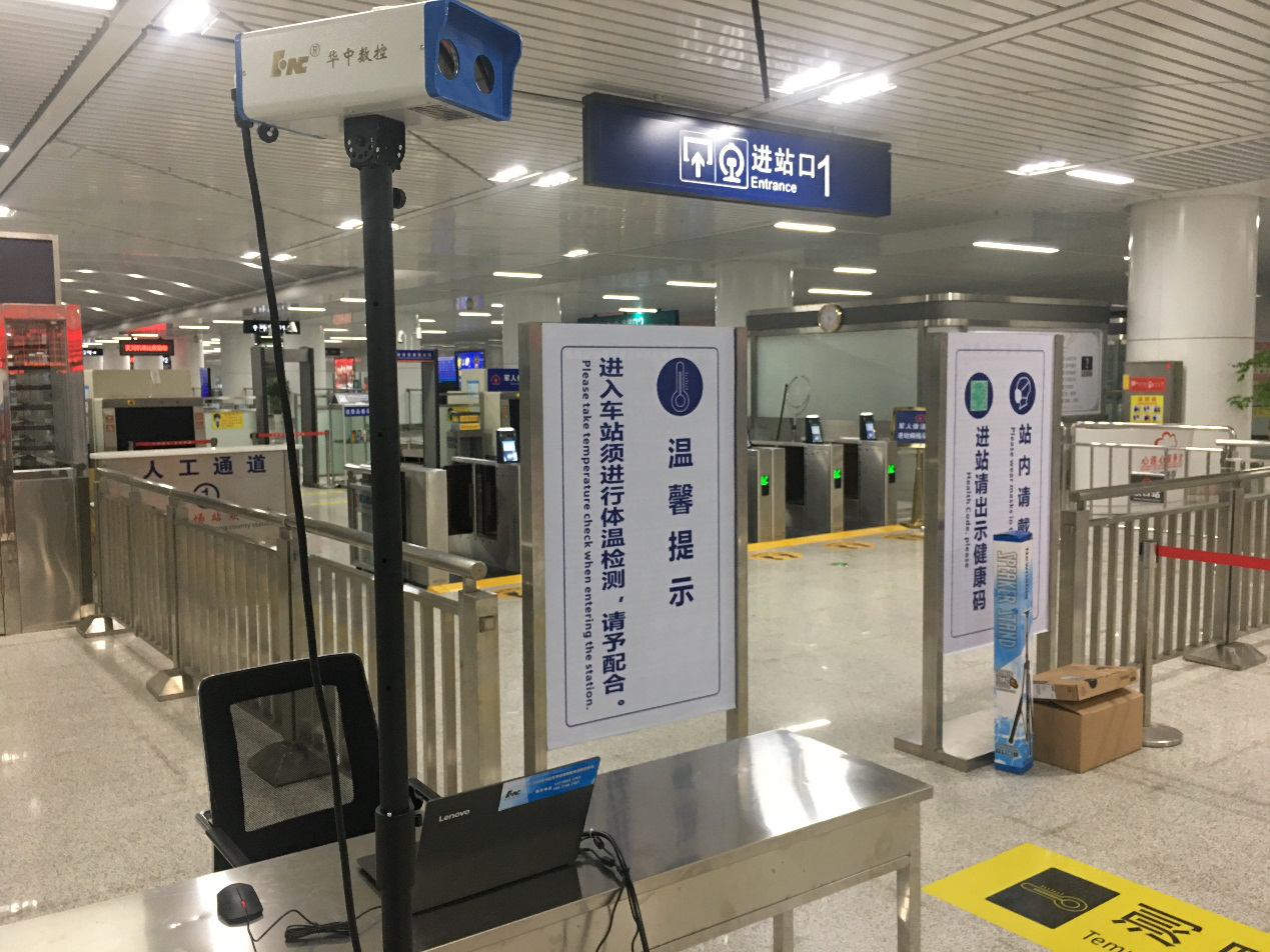 ?同天,一臺印著”華中數(shù)控“四個醒目字樣的”神秘設(shè)備”安裝在了城際鐵路天河機場站的進站口,像一位高大的衛(wèi)士佇立在那,睜著“雙眼”警惕的守衛(wèi)著旅客進站通道,它就是由武漢華中數(shù)控股份有限公司提供的HY-2005B/E型“紅外智能體溫檢測系統(tǒng)”。