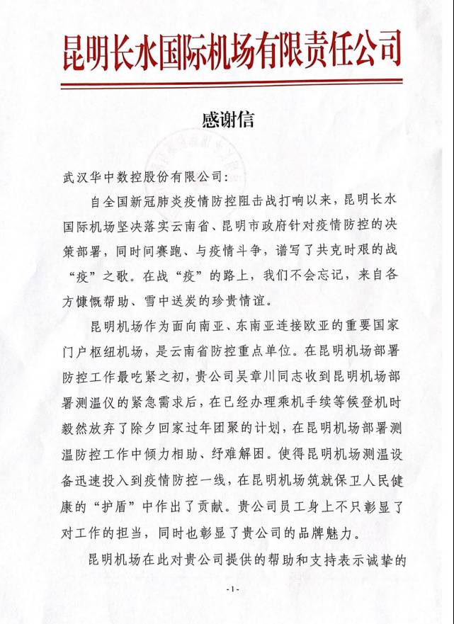 ?近日,為進一步加強境外疫情輸入防控工作,做好出入國內、國際候機樓人員體溫檢測工作,云南機場集團公司緊急安排在昆明機場安裝30套紅外智能體溫檢測儀,其余30多套紅外設備安裝在云南其余地市州機場,而在此之前已經有近200多套安裝在云南省各地市州,這些設備均由武漢華中數控股份有限公司自主研發生產。昆明機場作為面向南亞、東南亞連接歐亞的重要國家門戶樞紐機場,是云南省防控重點單位,華中數控此次全力配合機場防治疫情各項工作嚴而有序展開,為云南人民構筑起一道安全的防疫“天線”。為此,昆明機場專門發來感謝信,感謝華中數控為貴司疫情防控提供幫助。