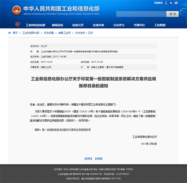 2017年12月20日,工信部正式發(fā)布了關(guān)于印發(fā)第一批智能制造系統(tǒng)解決方案供應(yīng)商推薦目錄的通知,為深入貫徹落實(shí)《中國制造2025》和《智能制造發(fā)展規(guī)劃(2016-2020年)》,加快培育智能制造系統(tǒng)解決方案供應(yīng)商,經(jīng)企業(yè)申報(bào)、專家評(píng)...